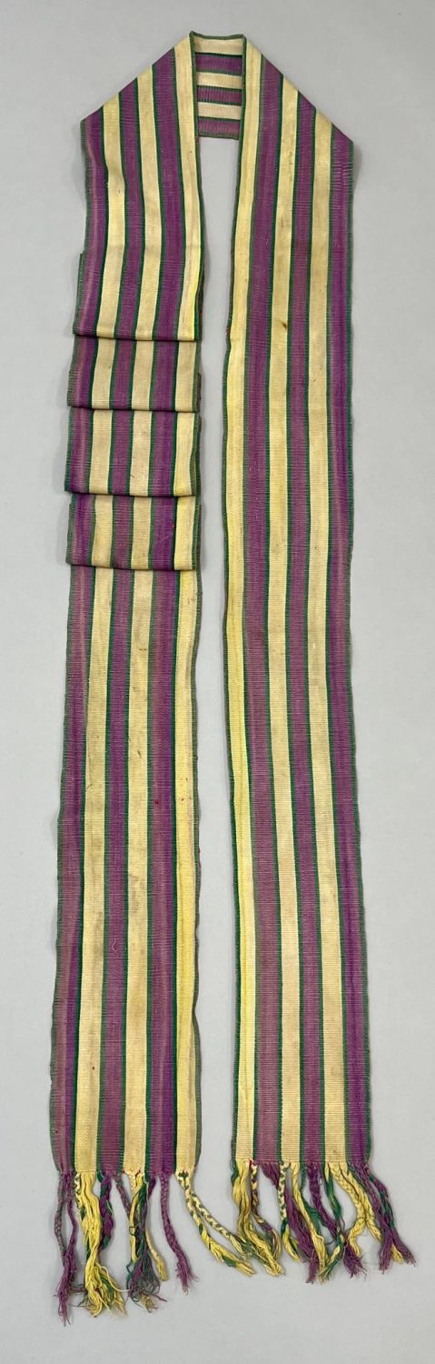 Santa Maria de Jesus, San Juan Atitlan, Guatemala, vintage woven cotton "Faja" sash, purple, green and yellow stripes, 147"l x 6"w