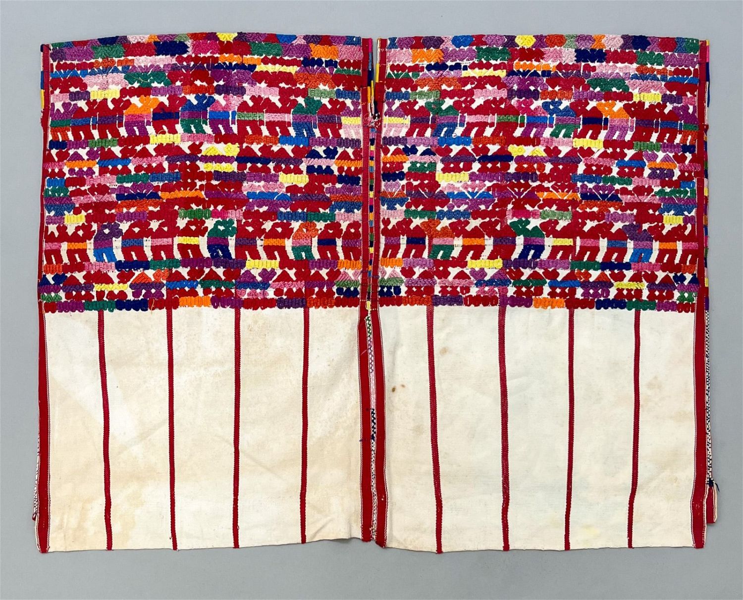 Santiago Sacatepequez, Sacatepequez Department, Guatemala, vintage woven undyed cotton "Huipil" tunic, red stripes with symbolic multicolor abstract animals pattern, 28"l x 35"w