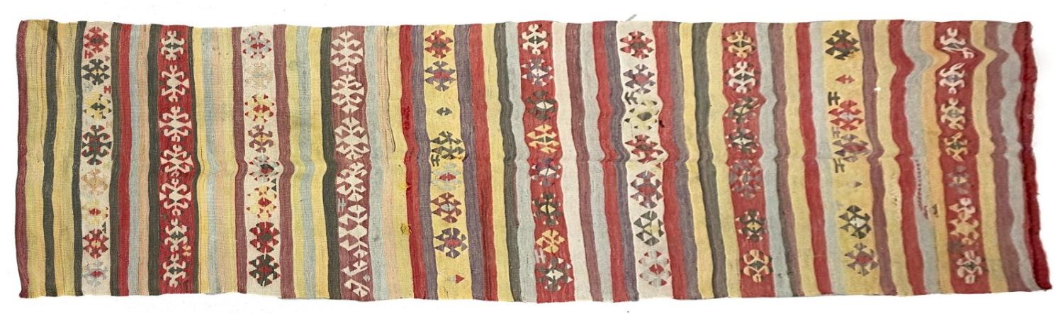 Vintage Handmade Turkish Kilim Runner, 41"w x 146"l Condition: Fair condition with some holes, fading and color bleed Dimensions: 31 in