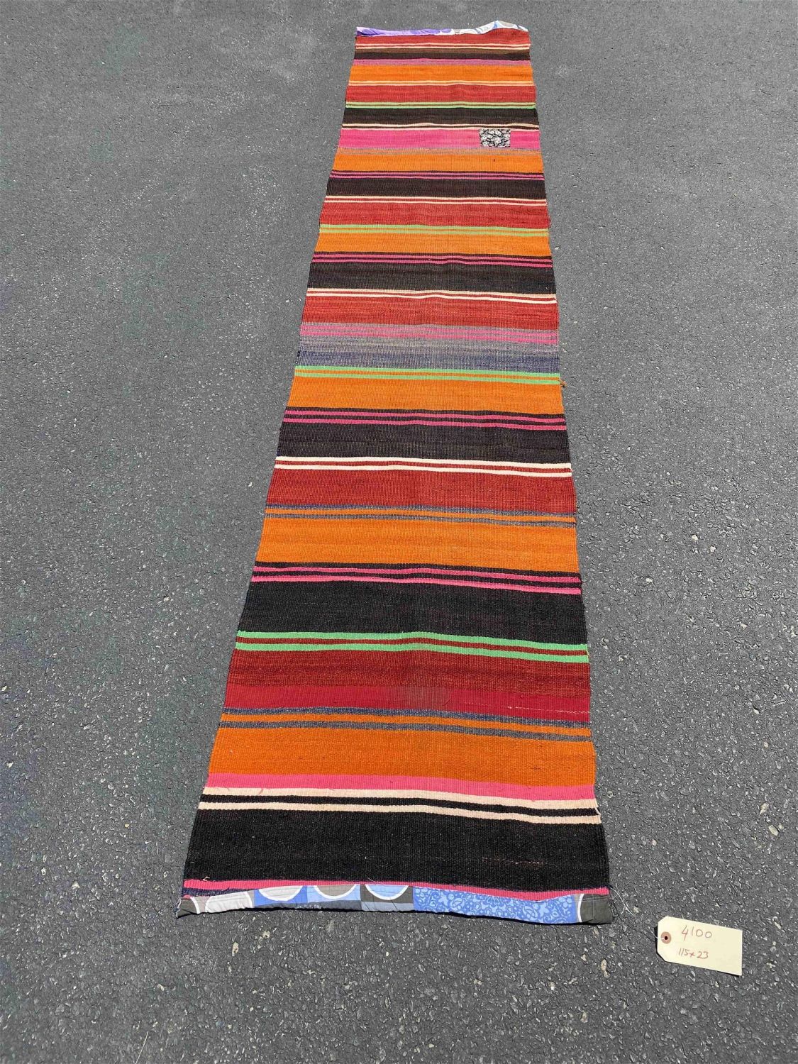 Vintage Handmade Kilim Runner, 23"w x 115"l Condition: Fair with a repair. Dimensions: 23 in