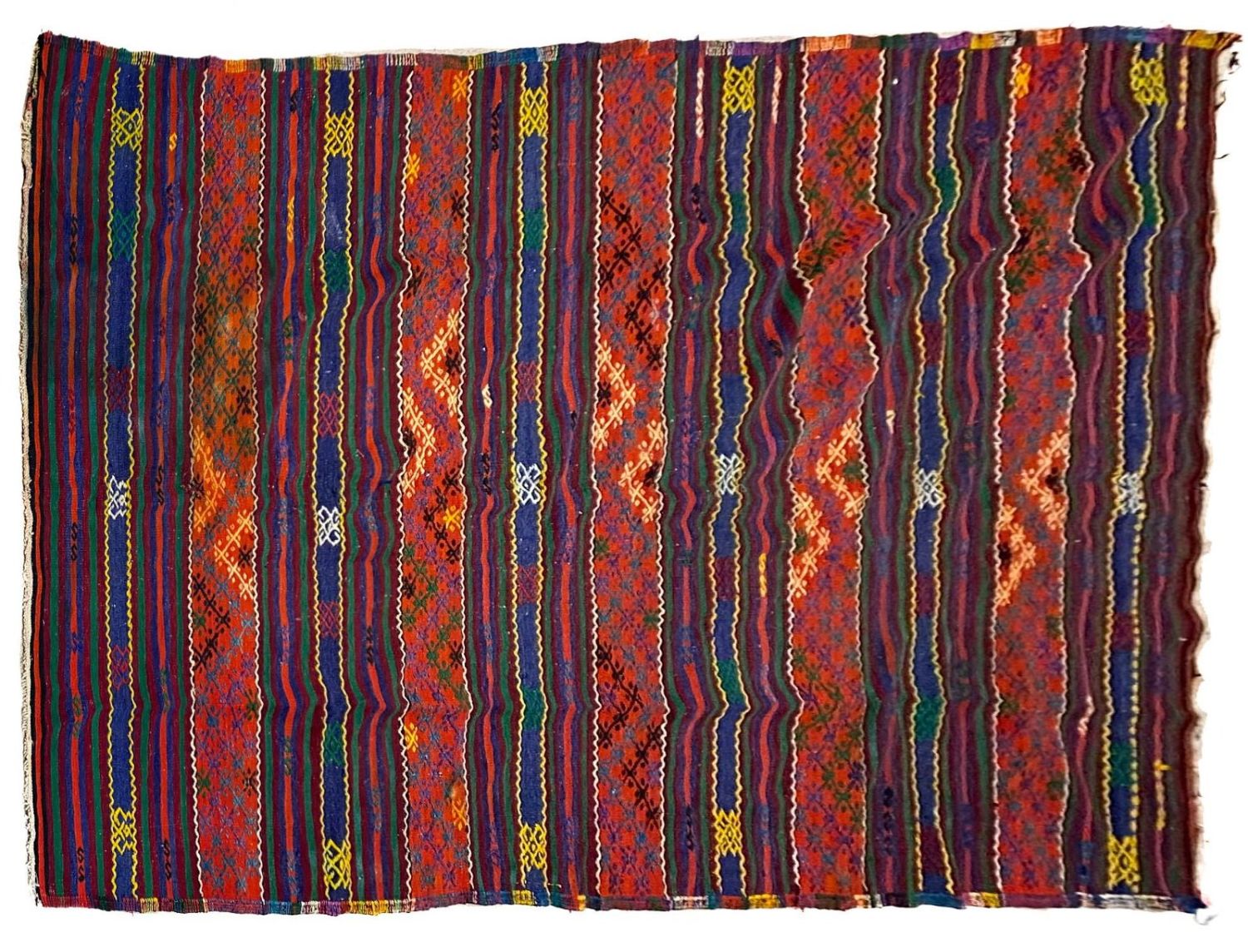 Vintage Handmade Area Rug, 70"w x 130"l Condition: Fair, fading areas and signs of wear. Dimensions: 70 in