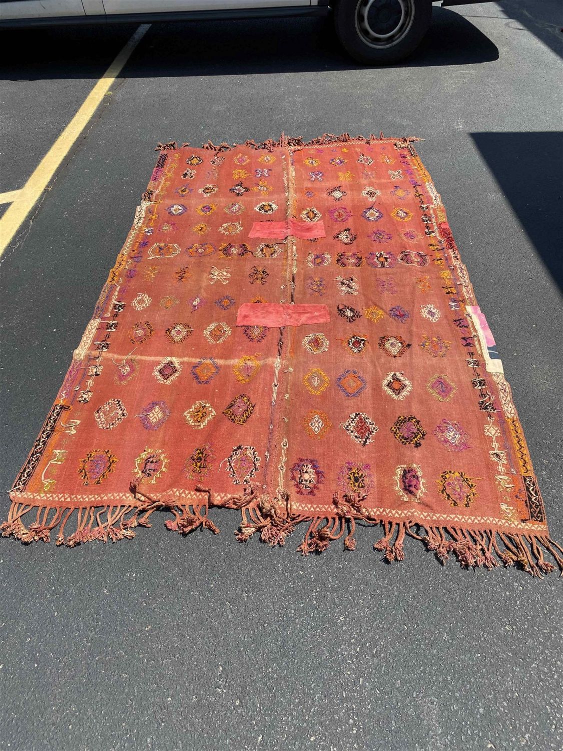 Vintage Handmade Turkish Kilim, 58"w x 93"l Condition: Fair, signs of wear, fading, some stain, few holes and repairs. Dimensions: 58 in