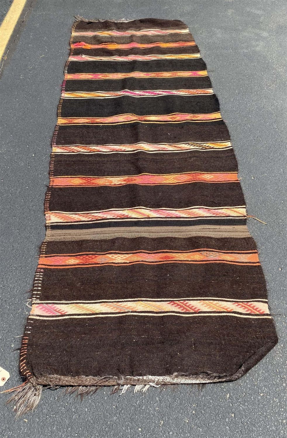 Vintage Handmade Turkish Runner, 35"w x 122"l Condition: Fair with couple repairs. Dimensions: 35 in