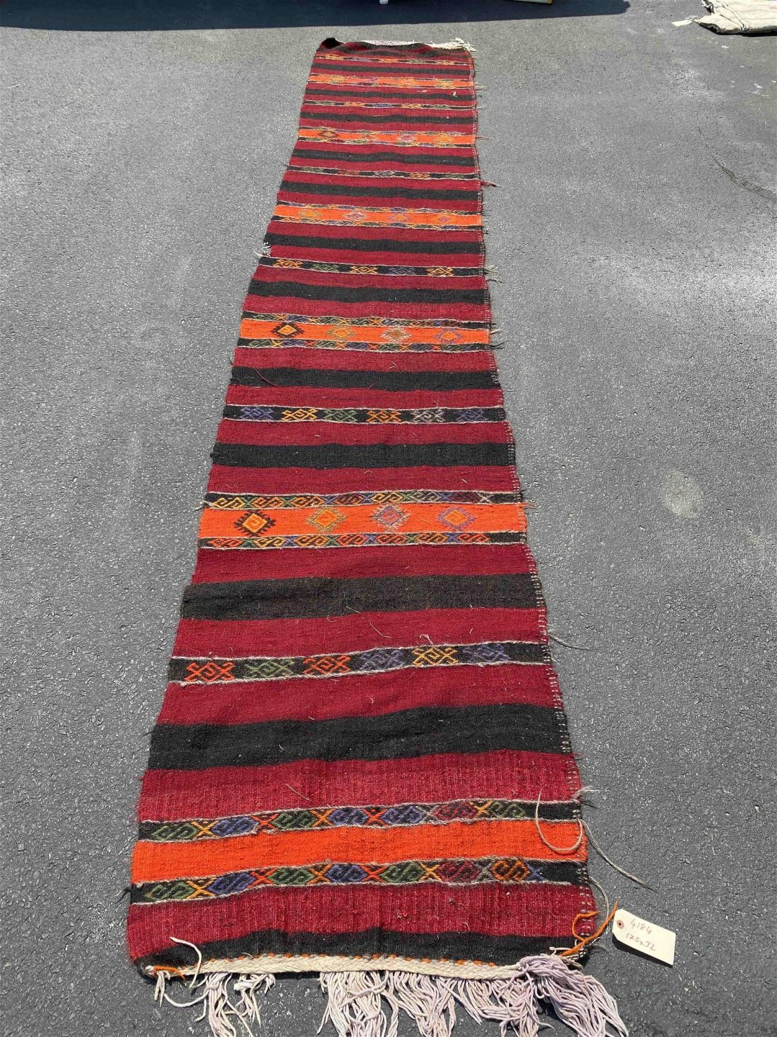 Vintage Handmade Turkish Kilim Runner, 32"w x 175"l Condition: Fair, Missing a small piece on one edge. Dimensions: 32 in