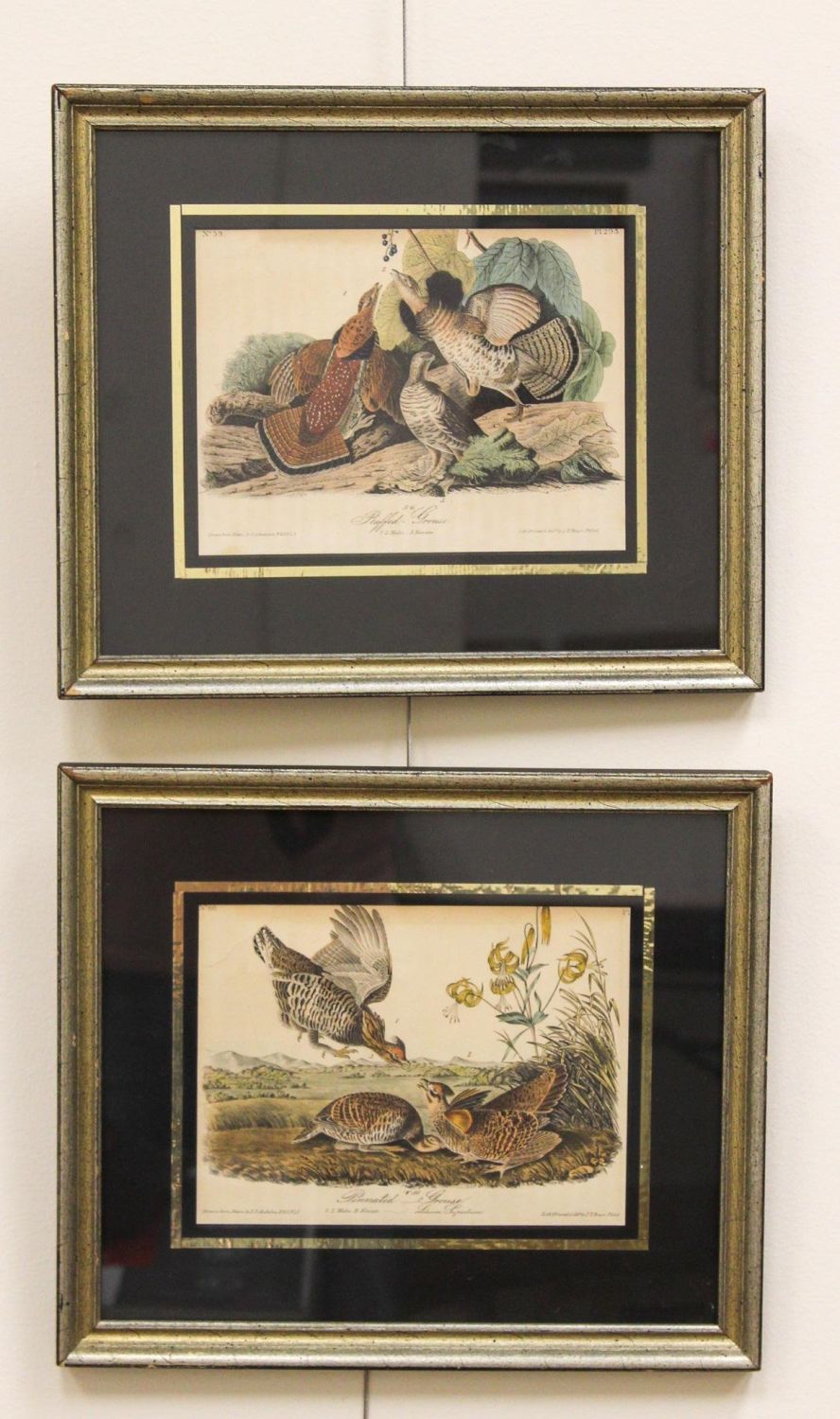 Pair of antique hand colored J.J. Audobon first edition lithographs c. 1840, " Ruffed – Grouse" No 59, Pl 293, " Pinnet Grouse" No 60, possibly Pl 296, printed and colored by J.T. Bowen, Philadephia, label on verso, 6"h x 8"w (sight), 11"h x 13"w x.75"d (frame)