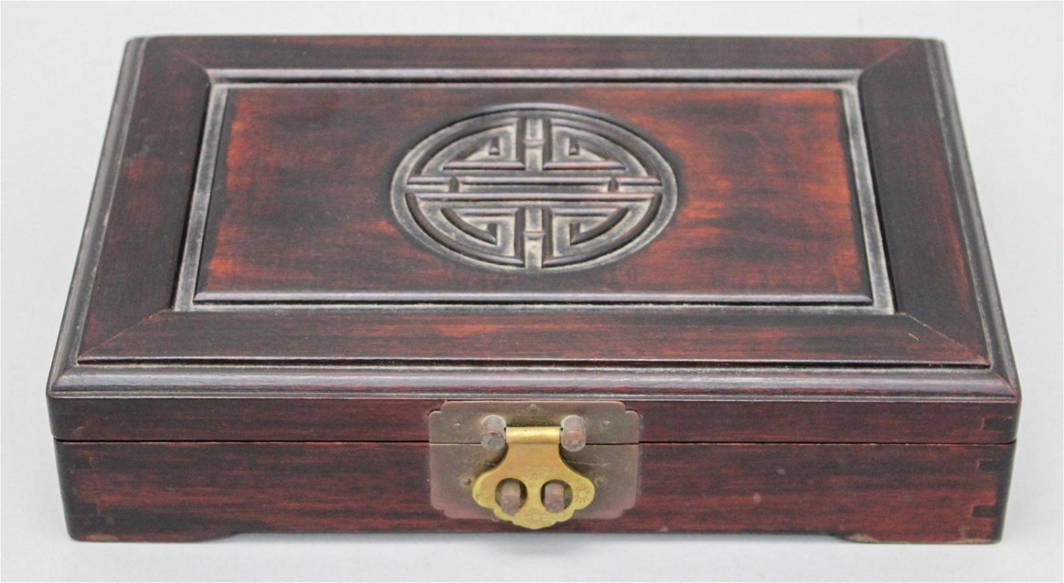Vintage possibly rosewood and brass hardware jewelry box, carved with chinese longevity ring on top, dovetailed corners, brown velvet lining inside, 2.25"h x 11"w x 7.5"d
