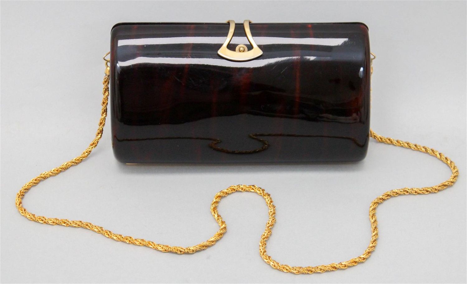 Sak Fifth Avenue Italian faux tortoise shell brown lucite evening clutch with gold tone rope chain strap, brown crushed velvet lining, dust cover included, 3.5"h x 6.5"w x 2.25"d, 14.5" strap drop