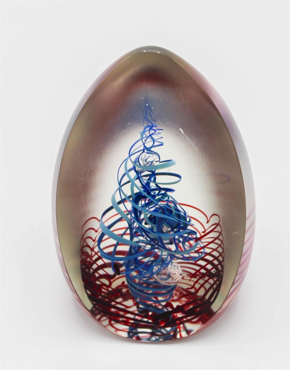 Henry Summa Art Glass paperweight egg shape with flat face and colored threads, signed June 1993, 06/129, 4.75"h x 3"d Condition: Good Dimensions: 4.75 x 3 in