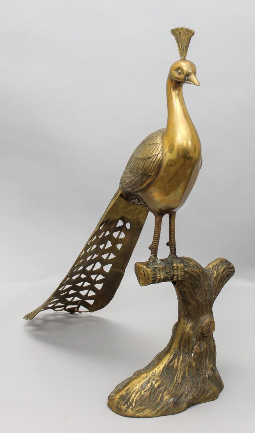 Cast brass peacock statue on perch, unmarked, 28"h x 28"w x 11"d