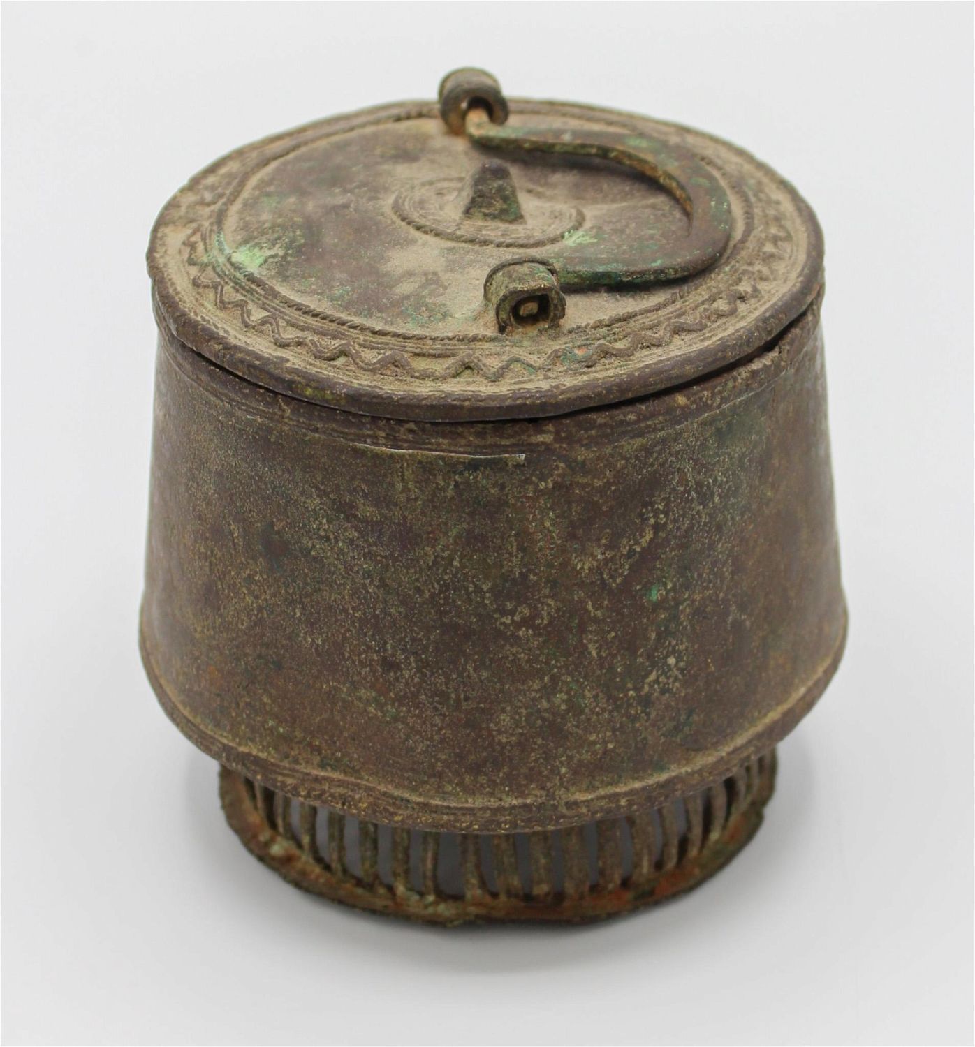 Antique bronze lidded jar with reticulated base, possibly African or Middle Eastern in origen, 4"h x 5"d