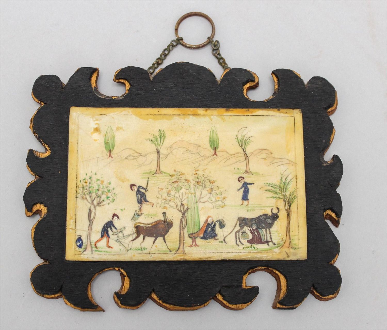Antique Persian miniature country scene painted on bone, 3.5"h x 5.25"w (sight) 5.25"h x 7"w