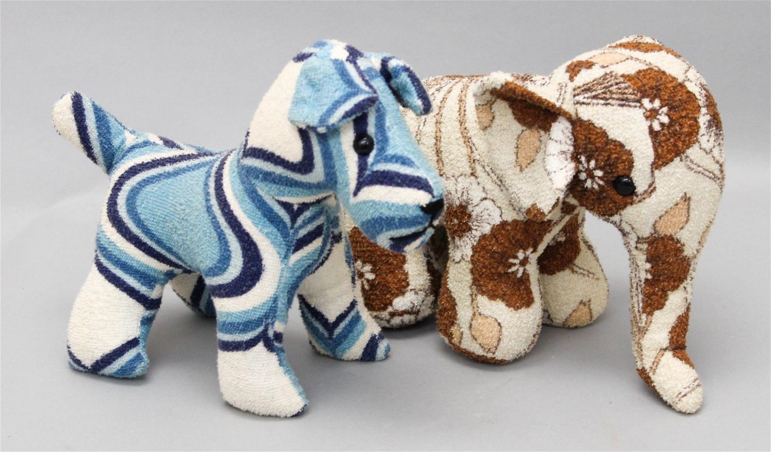 Pair of Andreas Linzner terry towel stuffed animals, elephant 8’h x 4"w x 11.5"d, dog 9"h x 4"w x 11.5"d Condition: Good, some dirt Dimensions: 8 x 4 x 11.5 in