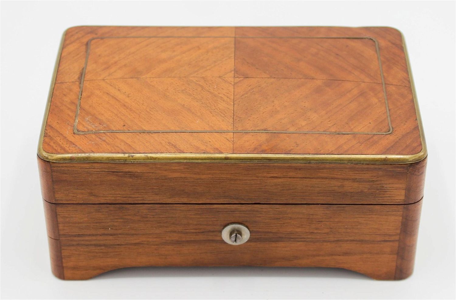 Vintage Swiss music box made by Chevob & Co late Baker, Troll & Co, four tune player, rosewood with brass inlaid, glass interior, manufacturers lable attached on the inside, numbered 8192 underneath, winder under side, 2.5"h x 6"w x 3.75"d