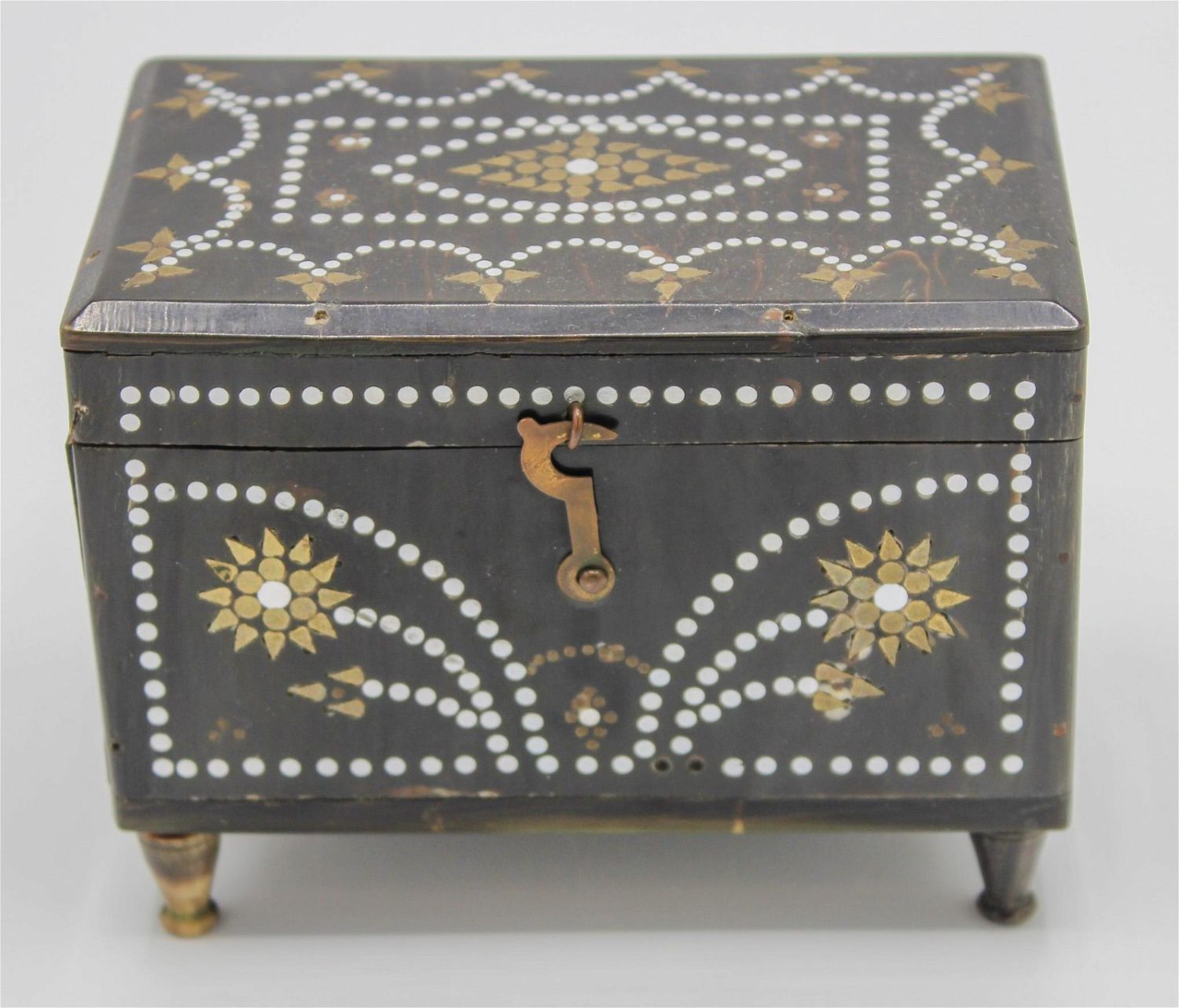 Horn decorative box with metal Inlay accents, 3.75"h x 5"w x 3"d Condition: Fair, missing some inlay, small crack on the lid edge Dimensions: 3.75 x 5 x 3 in