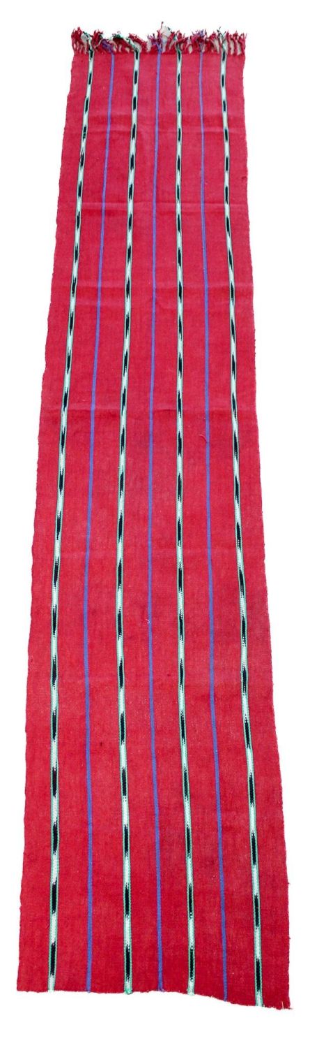 Possibly Mexican, vintage woven cotton textile, red ground with assorted color stripes pattern, 79"l x 15"w Condition: Good Dimensions: 79 x 15 in