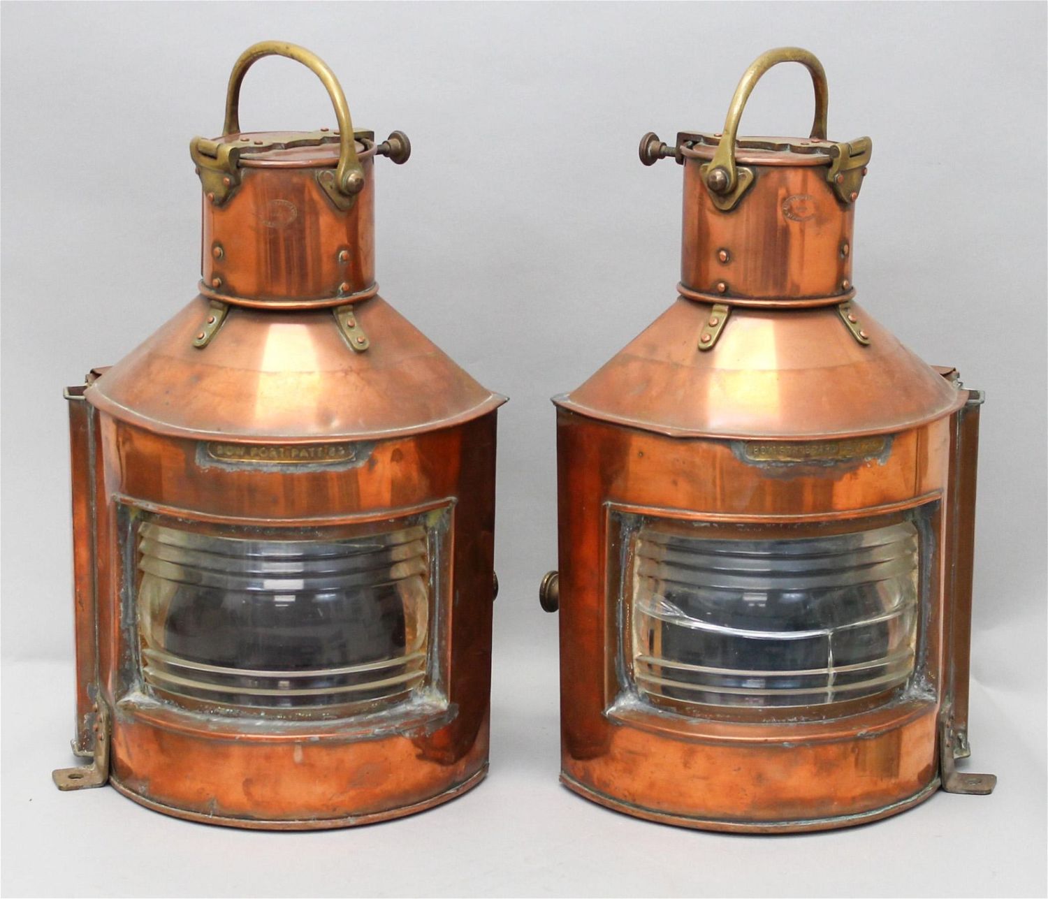 Pair of English vintage copper and brass ship lanterns, marked Alderson & Gyle Ltd 1944, Birmingham, Bow Starboard Patt 24, 18"h x 9"w x 7.5"d each