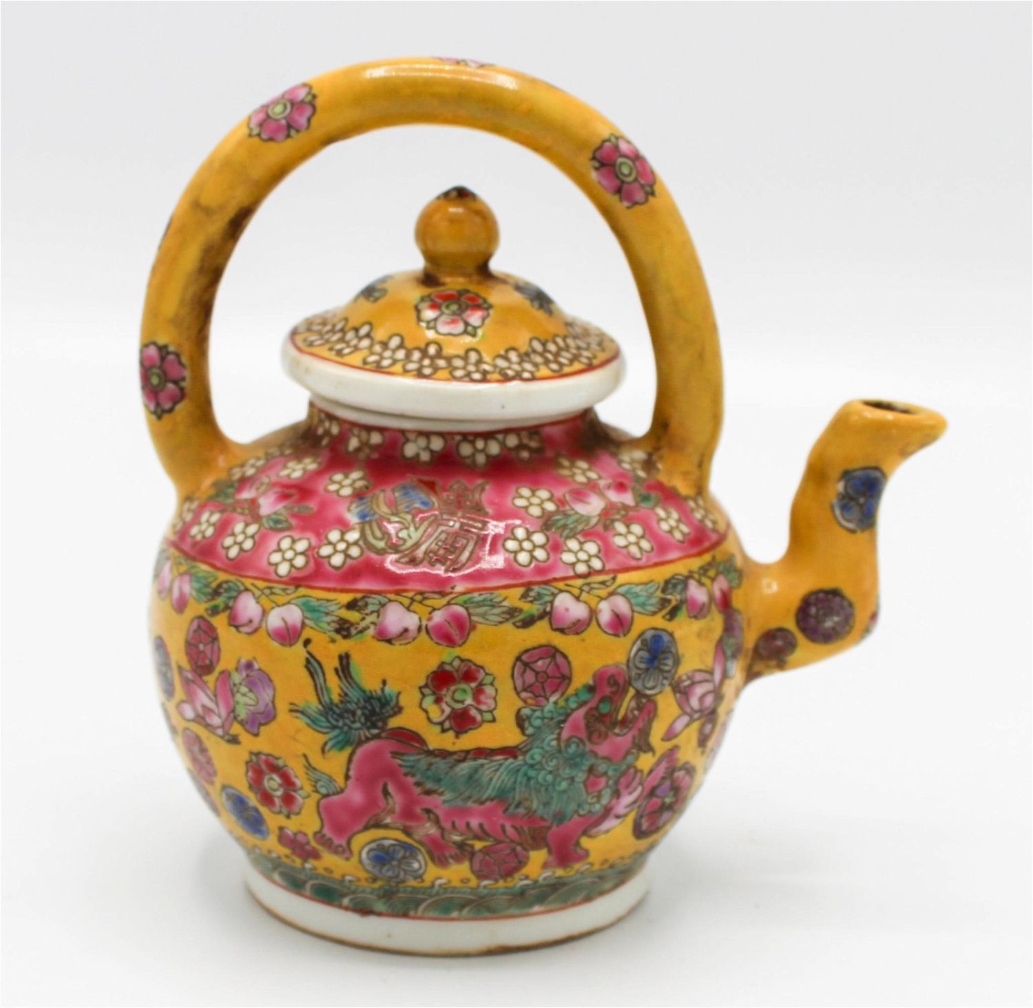 Antique possibly Qin Dynasty porcelain small teapot with handle, lid, Chinese characters, flowers and Lions, seal stamp on bottom, approx. 5"h x 3.25"d
