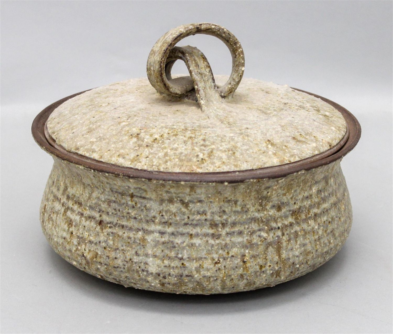Salt glazed stoneware pot with lid , cobalt blue interior, possibly signed Lindgren on the bottom, 8"h x 9.5"d Condition: Good Dimensions: 8 x 9.5 in
