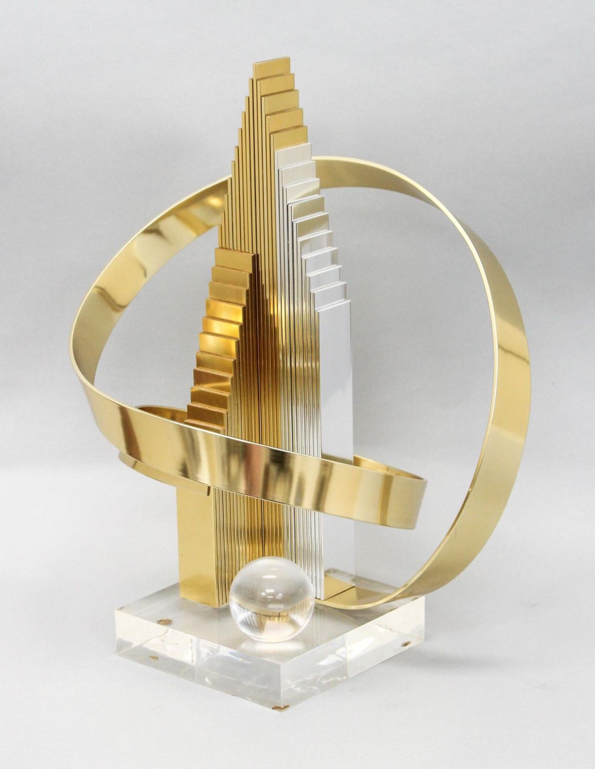 Attributed to Dan Murphy, gold and chrome colored ribbon and skyscraper-like abstract metal sculpture on lucite base with a clear sphere, unsigned, 18.25"h x 13"w x 7"d