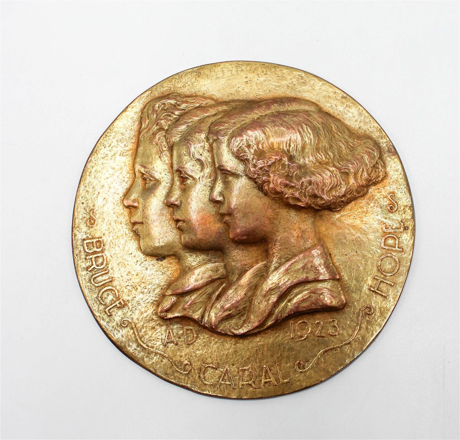 Vintage cast bronze medallion A. D. 1923 with American Businessman Bernard F. Gimbel’s children faces Bruce, Caral and Hope, unmarked, 5"d