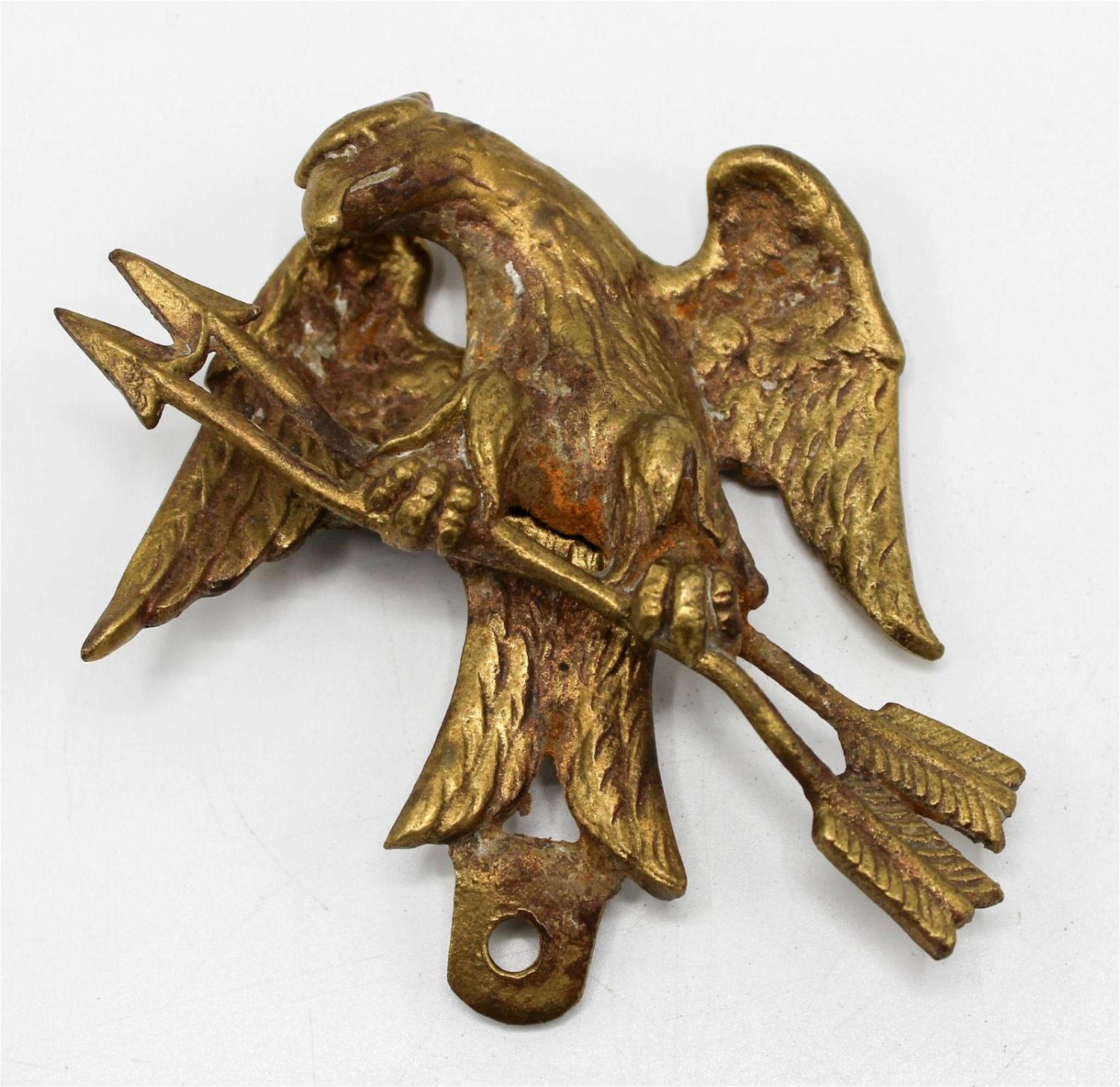 Vintage cast brass eagle with two arrows, cast is in two parts joined with a screw, possibly a component piece, unmarked, 3.25"l x 2.25"w