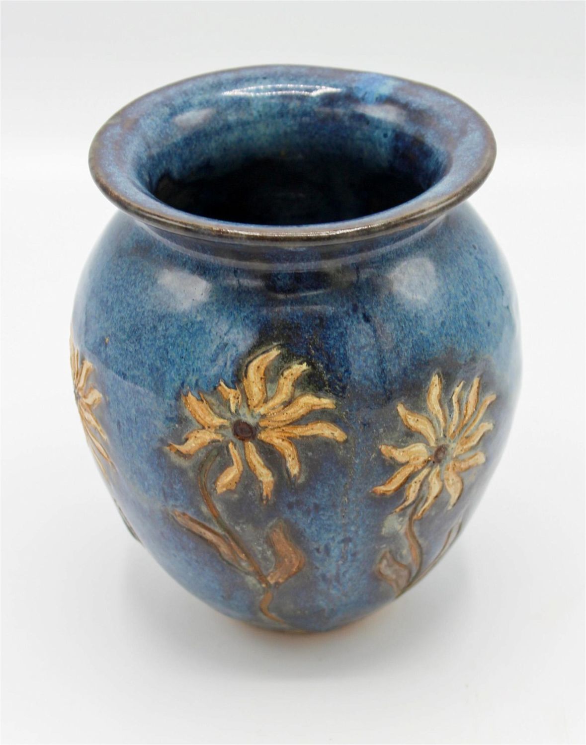 Studio made ceramic vase blue with three etched daisies, signed possibly BAC, 4/98, 6.5"h x 5"d Condition: Good Dimensions: 6.5 x 5 in