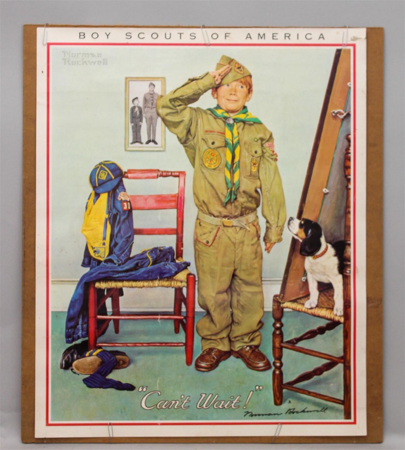 Norman Rockwell vintage Poster Boy Scouts of America "Can’t Wait", unframed, 27"h x 22"w Condition: Fair, some creases, some foxing spots Dimensions: 27 x 22 in