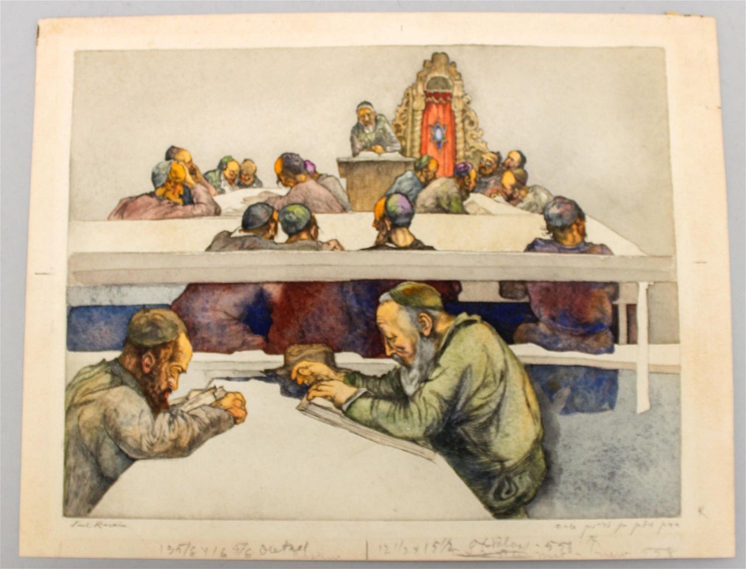 Saul Raskin (Russian/American 1878-1966) hand colored etching "Jewish Scholars", signed lower left, unframed, 9.5"h x 12"w