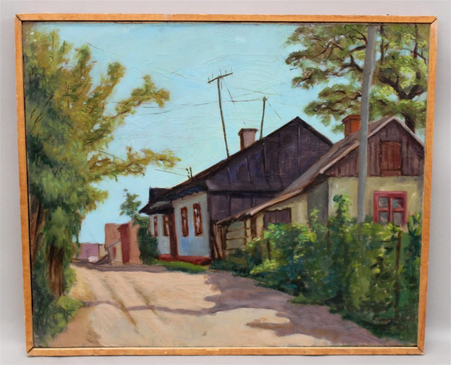 Soviet Union era Village Street Scene oil on canvas, illegible signature in Cyrillic letters dated 1989 lower right, Soviet export stamp on verso, 17"h x 20"w (sight) 18"h x 21.25"w (frame)