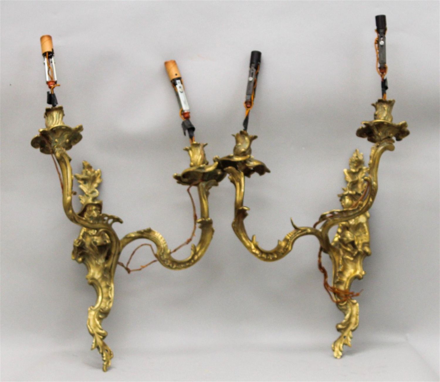Pair of cast brass most likely French 2-light sconces with female and male figures, unmarked, 23"h x 13"w