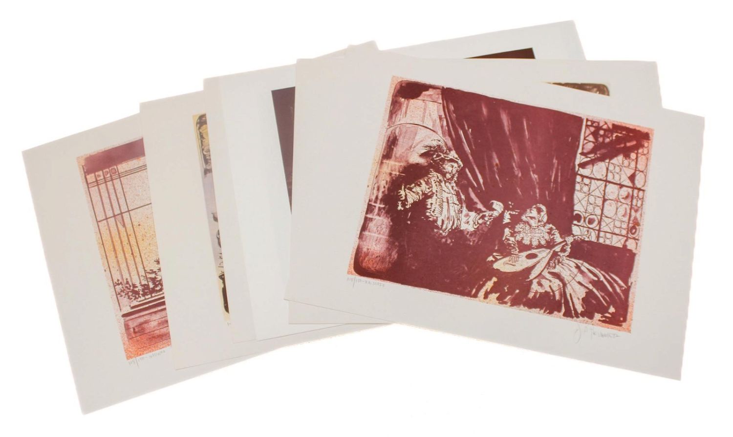 Group of (6) limited edition Joe A. Pecsenke Opera Series 108/150, "Falstaff", "La Boheme", "Barber of Seville", "Un Ballo in Maschera", "The Flying Dutchman", "Madame Butterfly", maroon silkscreen prints, pencil sign lower right J. A. Pecsenke 82, unframed, 18"h x 25"w