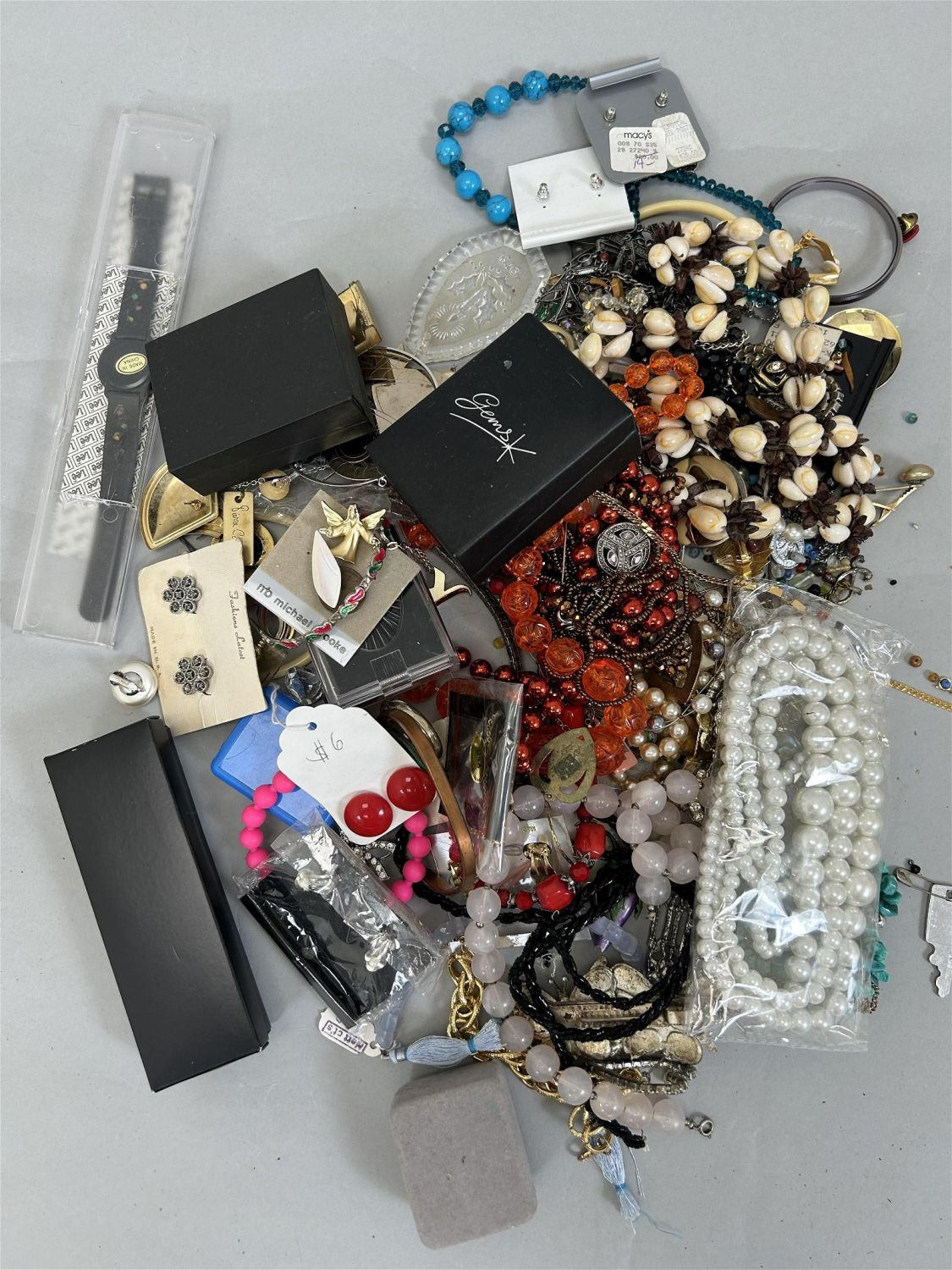 Lot appears to contain Earrings Bracelets Necklaces Brooches Rings, Watches Approximately 4 Pounds Condition: Condition varies