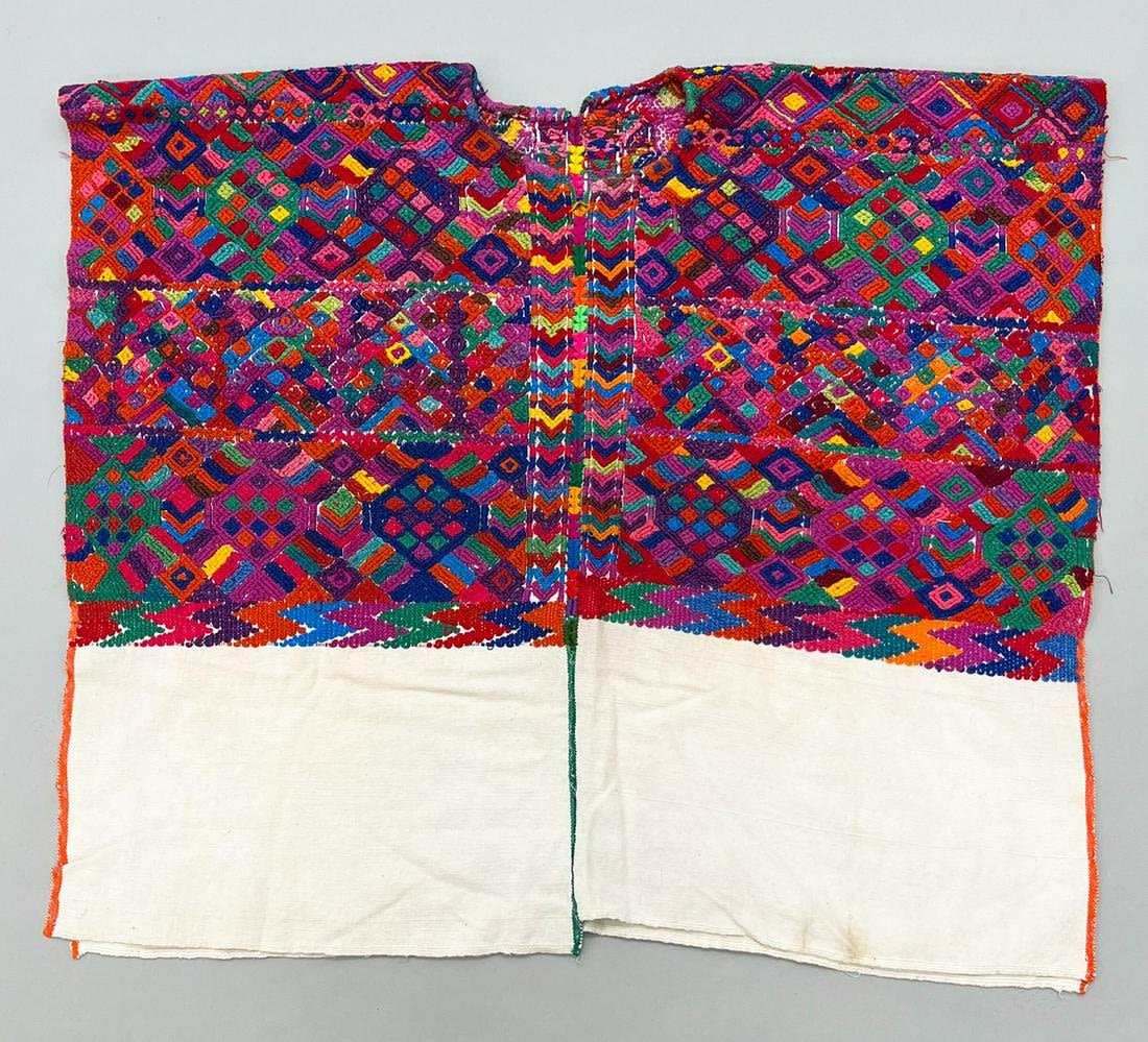 San Jose Nacahuil, Guatemala Department, Guatemala, vintage woven cotton "Huipil" tunic, undyed cotton with vibrant multicolor geometric pattern, 26"l x 29’w