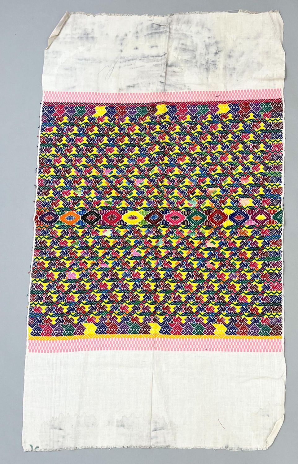 Totonicapan, Guatemala, vintage woven cotton "Tezute" wrap, undyed cotton with symbolic vibrant color pattern, 61"l x 34’w