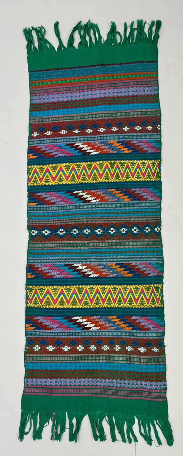San Antonio Aguas Calientes, Sacatepequez, Guatemala, vintage woven cotton serviette, green ground with vibrant colors pattern, 45"l x 17"w