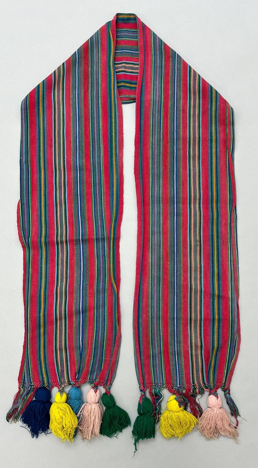 San Juan de Cotzal, Quiche Department, Guatemala, vintage woven cotton "Tocoyal" head wrap with multicolor stripes and tassels, 65"l x 8"w