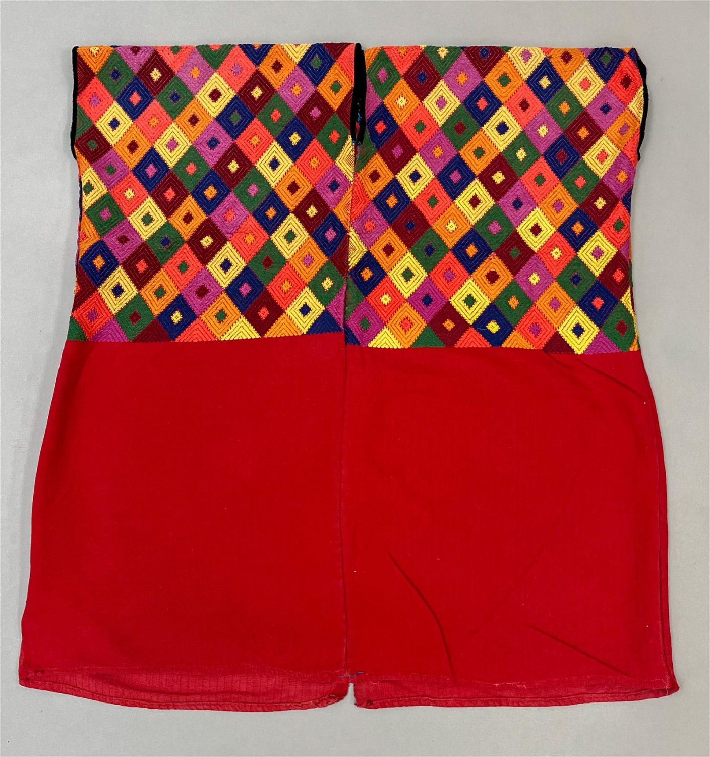 Almolonga, Quetzaltenango Department, Guatemala, vintage woven cotton "Huilpil" tunic, traditional red with vibrant colored diamond pattern (representing four corner of the universe), 34"l x 32"w