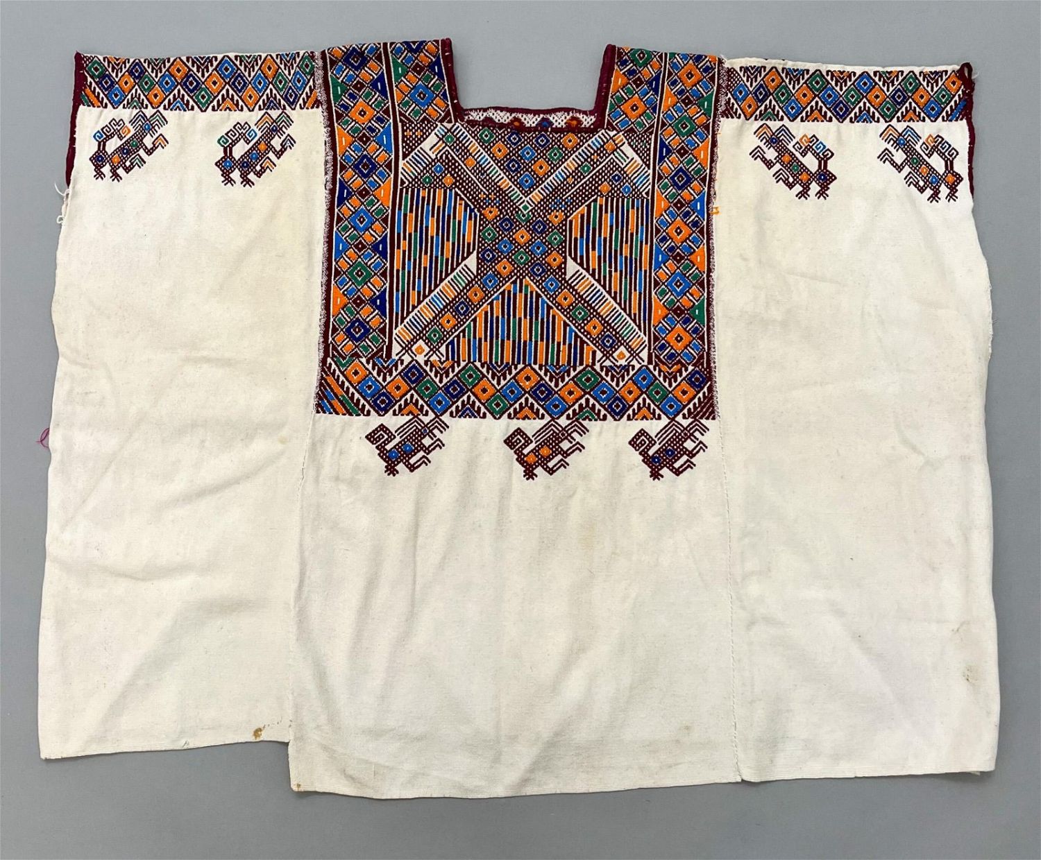 Nahuala, Solola, Guatemala, vintage woven undyed cotton "Huipil" tunic embroidered with symbolic bird and geometric motifs, 24"l x 32"w