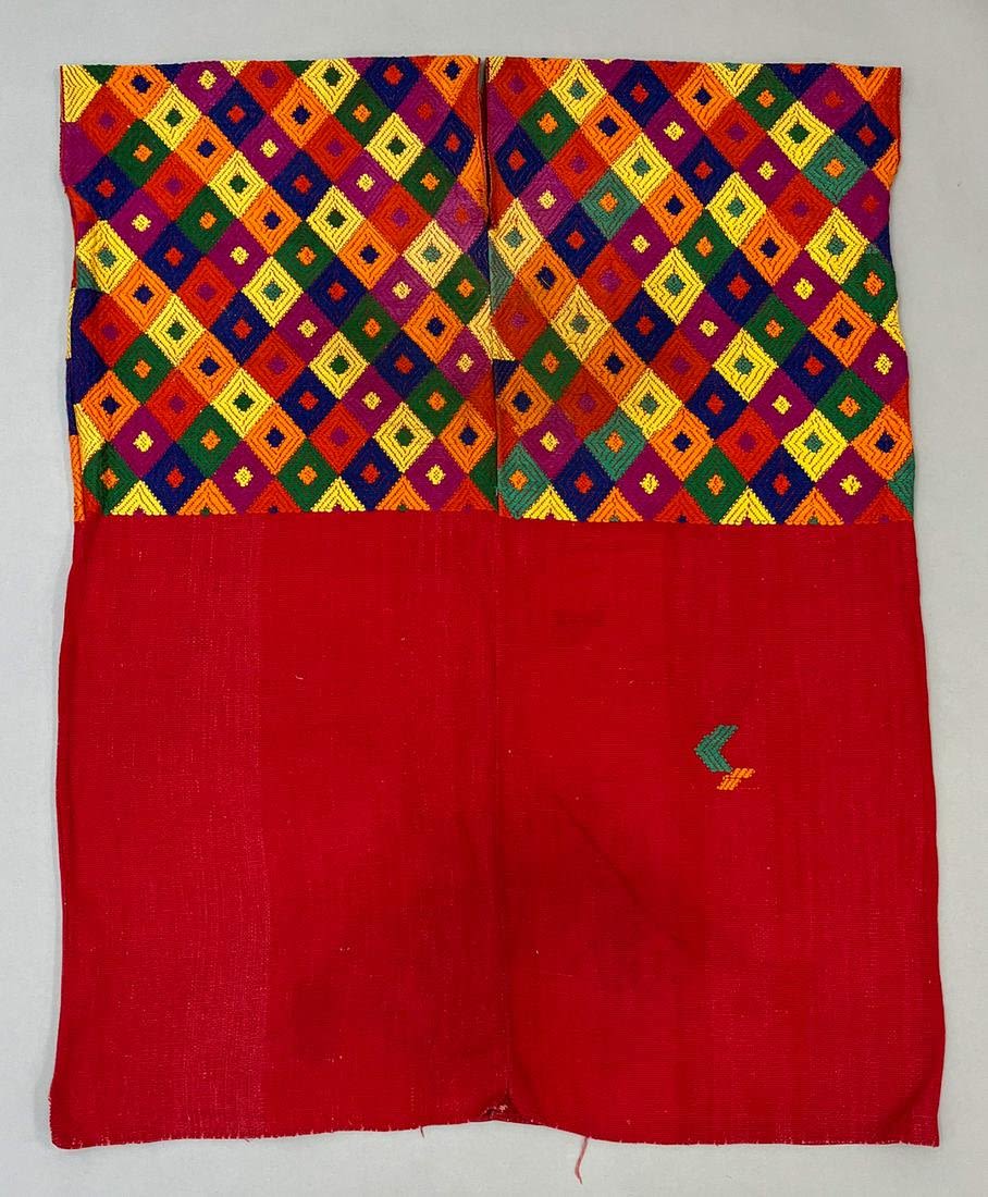 Almolonga, Quetzaltenango Department, Guatemala, vintage woven cotton "Huilpil" long tunic, red ground with vibrant colors rhombus (representing four corner of the universe) pattern, 40"l x 31"w