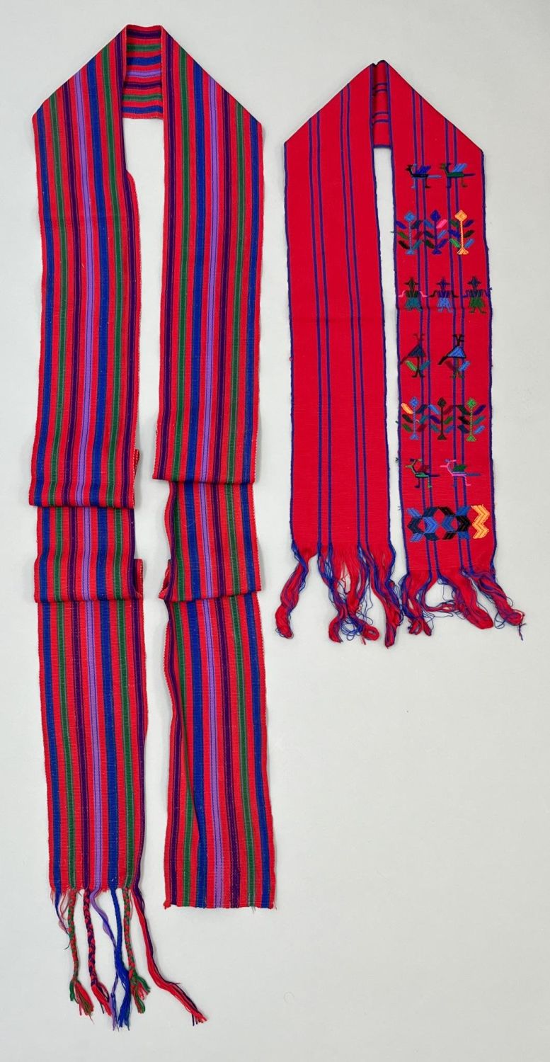 Santa Maria de Jesus, San Juan Atitlan, Guatemala, group of (2) vintage woven cotton "Fajas" sashes, red ground with assorted color stripes, embroidered with symbolic pattern, woman’s 114"l x 5"w, man’s 58"l x 5"w