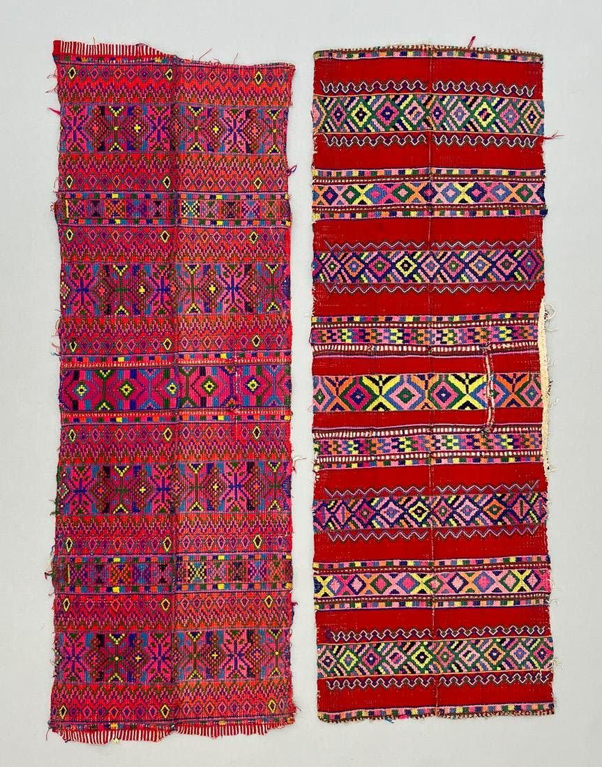 Todo Santos Cuchumatan, Huehuetanango Department, Guatemala, group of (2) vintage woven cotton remnants with geometric symbolic vibrant tones pattern, 9"l x 27"w, 10"l x 25"w