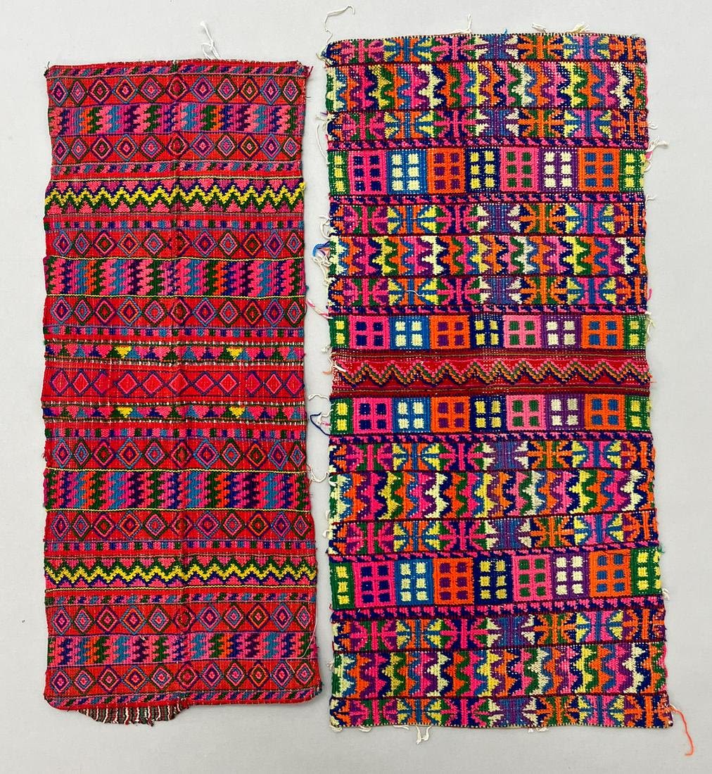 Todo Santos Cuchumatan, Huehuetanango Department, Guatemala, group of (2) vintage woven cotton remnants with geometric symbolic pattern, 20"l x 9"w, 19"l x 7"w