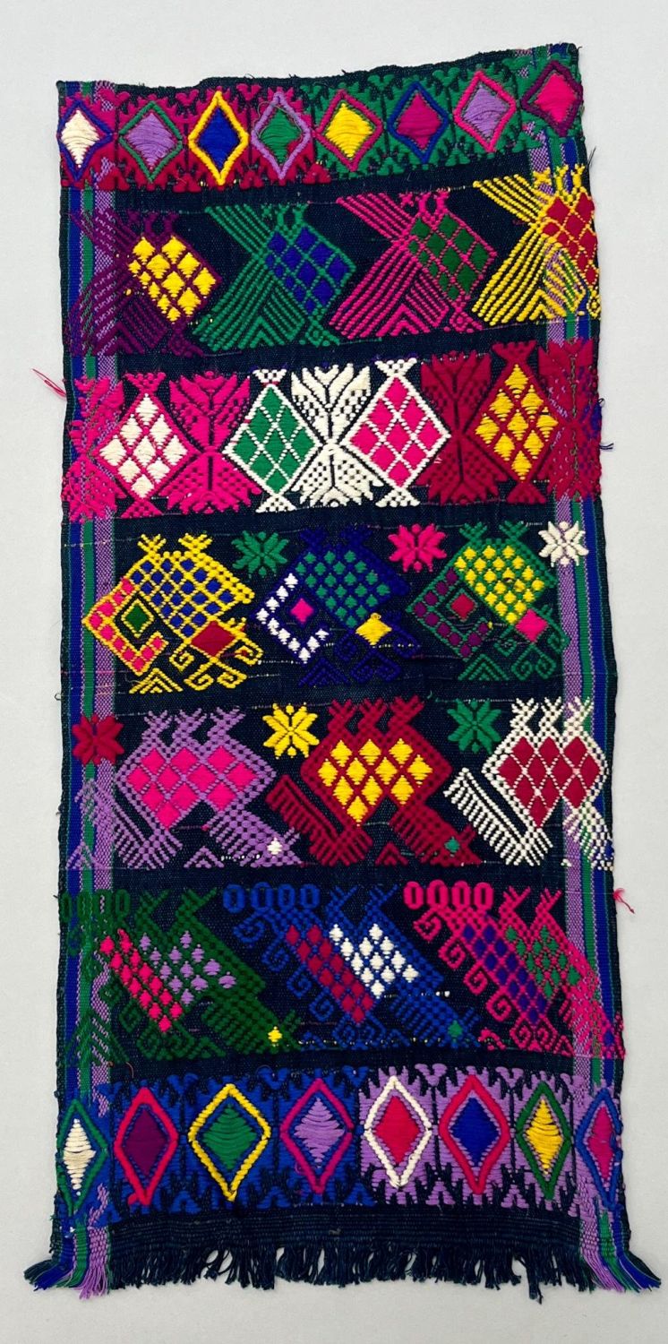 Santa Maria de Jesus, San Juan Atitlan, Guatemala, vintage woven cotton remnant with vibrant colors abstract animals and geometric pattern, 25"l x 11"w
