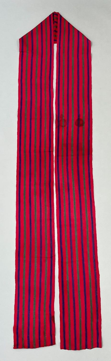 Santa Maria de Jesus, San Juan Atitlan, Guatemala, vintage woven cotton man’s "Faja" sash, red ground with green and blue color stripes, 143"l x 7"w