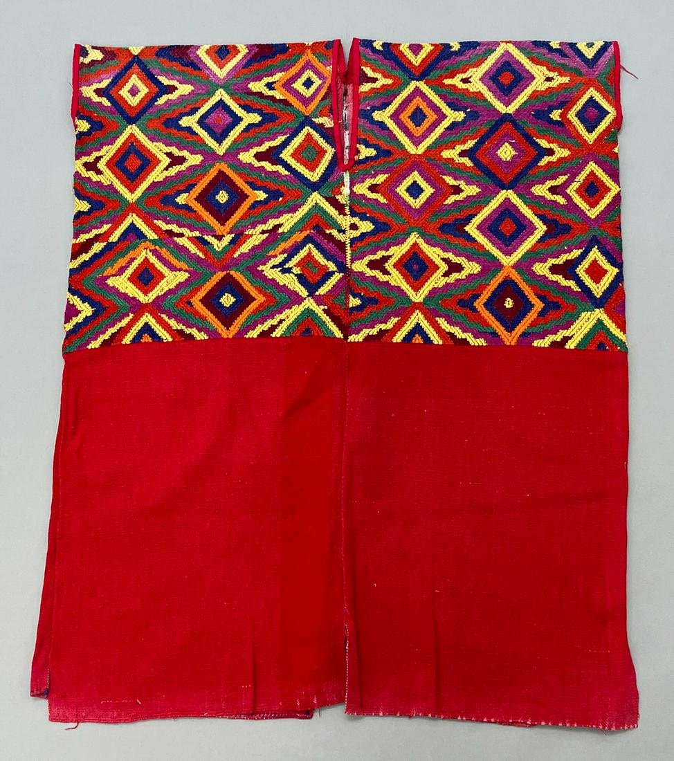 Almolonga, Quetzaltenango Department, Guatemala, vintage woven cotton "Huilpil" tunic, traditional red with vibrant color diamond pattern (representing the four corners of the universe), 35"l x 29"w
