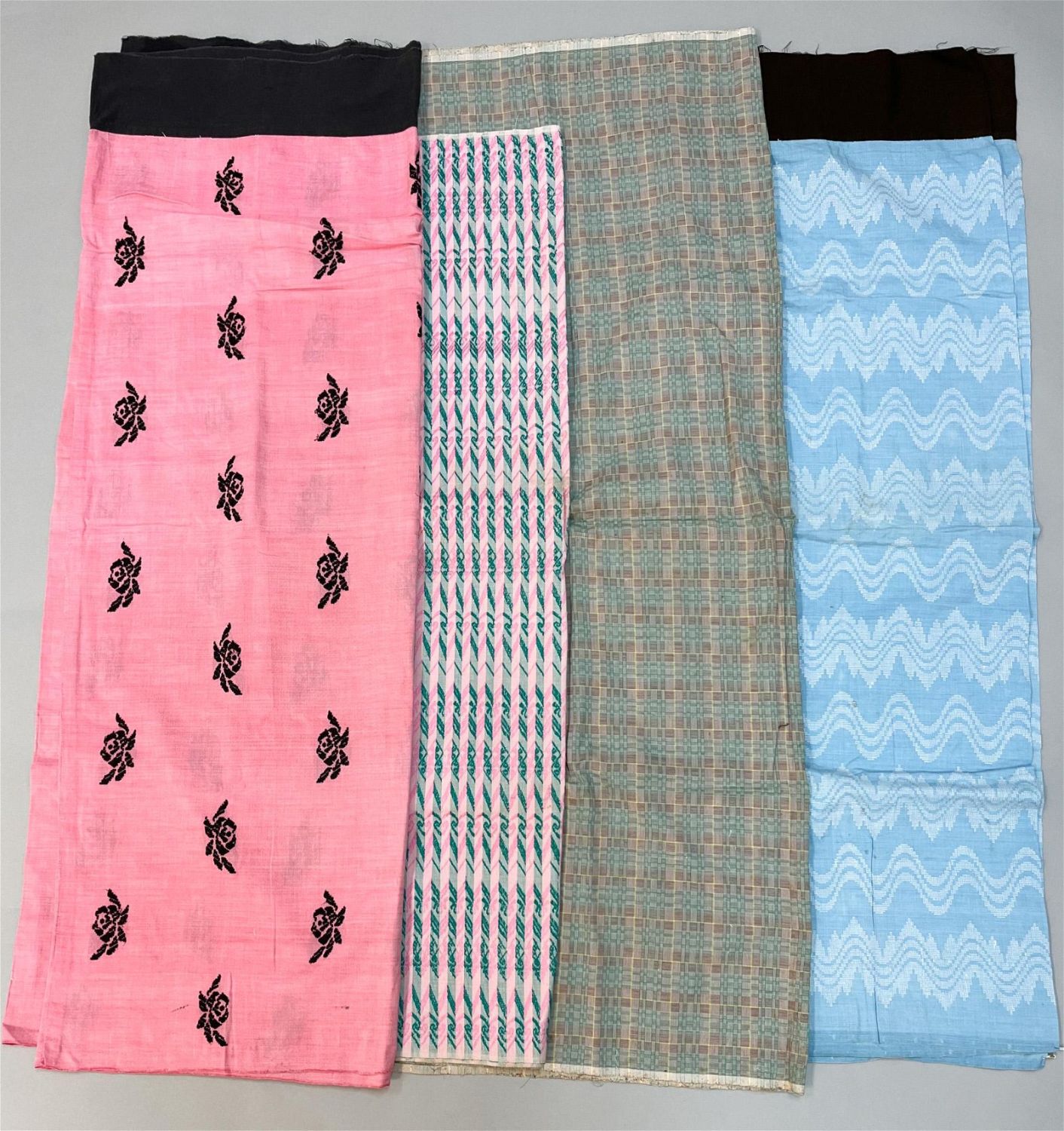 Burma/Myanmar, group of (4) woman and man’s cotton "Longyi" tubular Sarong, assorted colors and patterns, (3) woman’s longyi, 39"l x 28"w (Amarapura, c. 1965), 43"l x 30"w (Mrauk U c. 1970), 43"l x 29"w (Gangaw Township, c. 1980), (1) man’s longyi 45"l x 35"w (c. 1980’s)