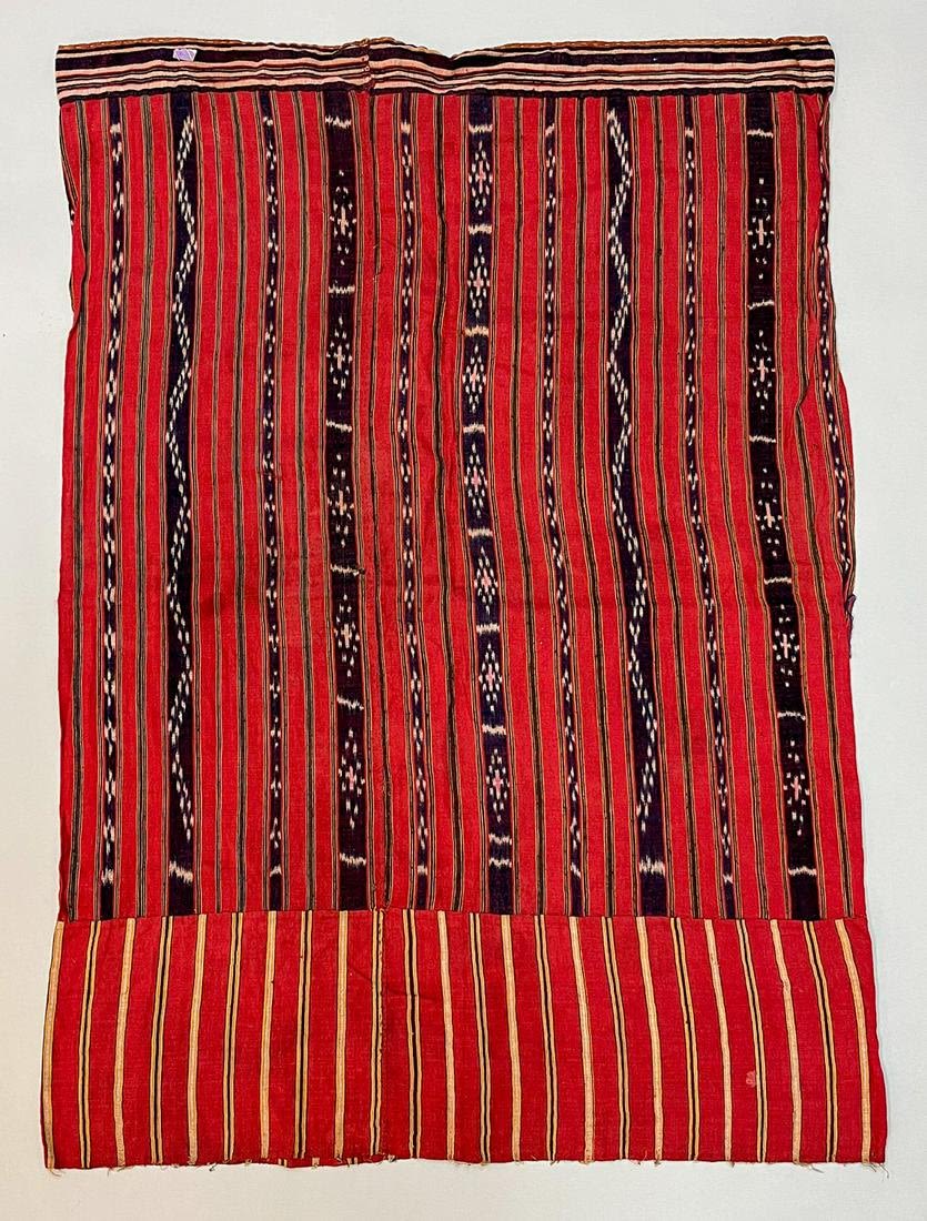 Laos, vintage woven cotton tubular sarong, red, purple, yellow stripes with traditional pattern, 35"l x 24"w