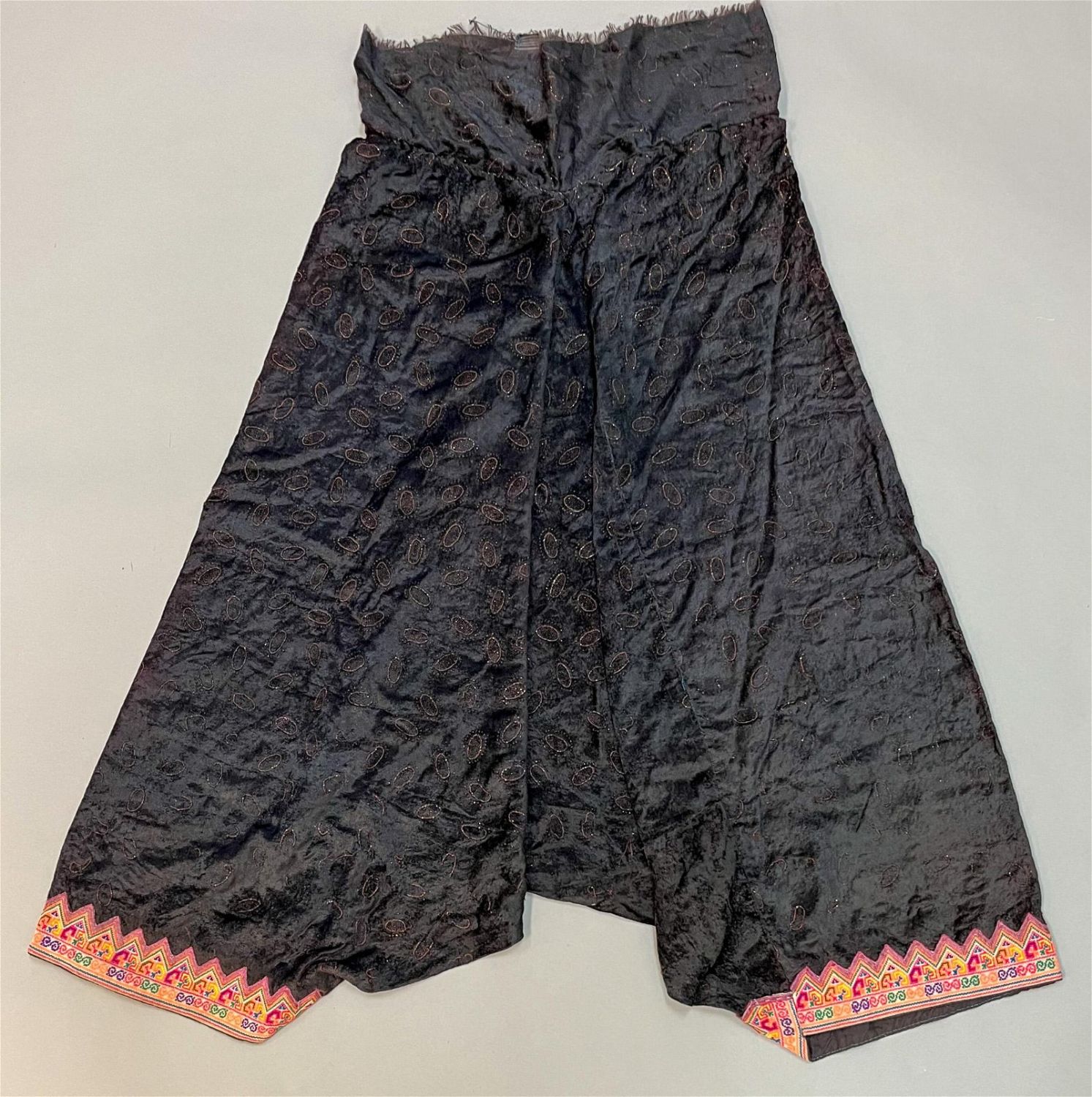 Guizhou Province Southwest China, vintage possibly silk velvet harem pants, black with metallic thread and colorful embroidery accent on legs, 38"l x 44"w