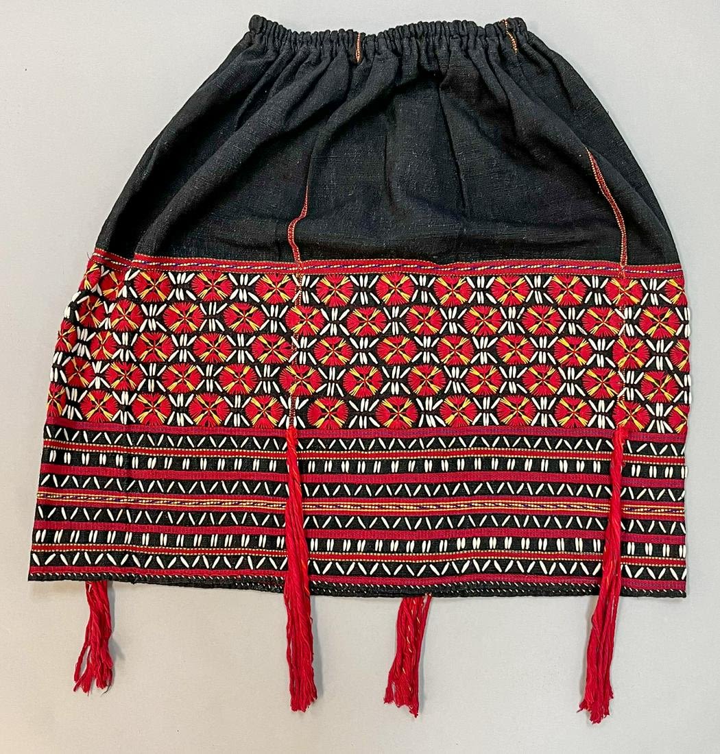 Miao/Hmong, Yunnan Province, China, vintage cotton skirt with seed beads, yellow, and red embroidery, 22"l x 24"w