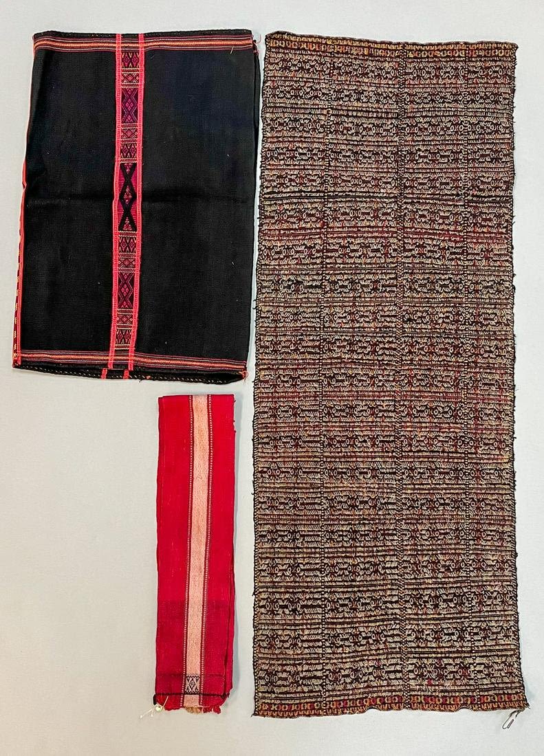 Lay Tu Chin, Myanmar (Burma), group of (3) vintage woven cotton accessories, one possibly head cover with intricate pattern, 29"L x 11"w, one apron in black with bright pink accent pattern, 21"l x 15"w, one man’s head wrap, 53"l x 3"w